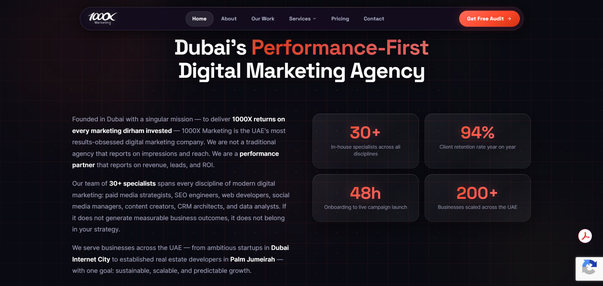 In Dubai's hyper-saturated digital marketing landscape, agencies default to selling vanity metrics — impressions, reach, and clicks — while hiding pricing behind opaque "contact us" forms. 1000X Marketing possessed a formidable operational model (48-hour campaign launches, 30+ in-house specialists, and a 94% retention rate), yet their digital footprint suffered from critical structural failures. Core service pages — SEO, PPC, Web Development — returned 404 errors, instantly destroying organic search potential and user trust. Furthermore, their portfolio presented a severe positioning mismatch: while claiming dominance in Dubai real estate and regional F&B, the only visible case studies were for US-based dental laboratories. The brand needed to pivot from a structurally flawed brochure site into a high-converting, transparent authority that matched their bold "1000X" multiplier promise.