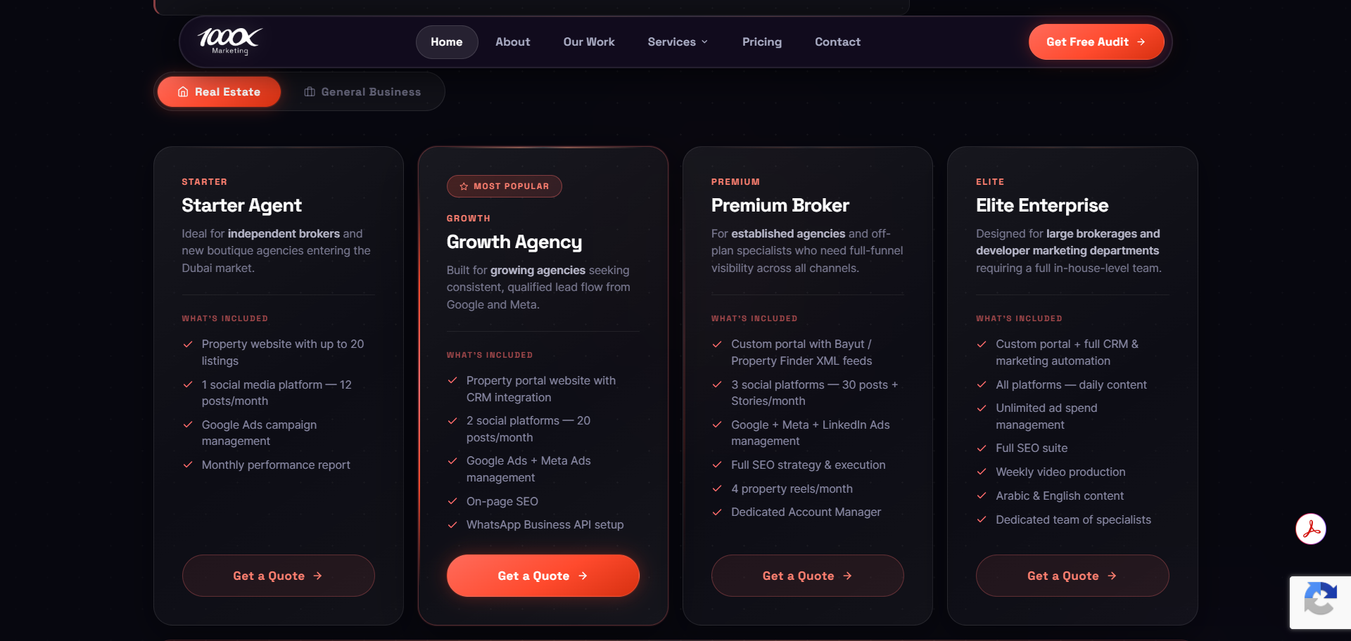 The strategy was rooted in radical transparency and vertical authority. We recognized that B2B buyers in Dubai conduct extensive stealth research before engaging sales. Therefore, we architected a frictionless pricing page that clearly delineates packages from "Essential Presence" to "Digital Transformation," explicitly separating agency fees from ad spend. We designed the site architecture to segment users by industry, creating a flagship Real Estate Marketing funnel that speaks directly to the nuances of Bayut/Property Finder XML integration and off-plan investor targeting. The UX was optimized for immediate action, utilizing a persistent "Get Free Audit" header CTA and a 60-minute response promise to capture high-intent leads at every scroll depth.